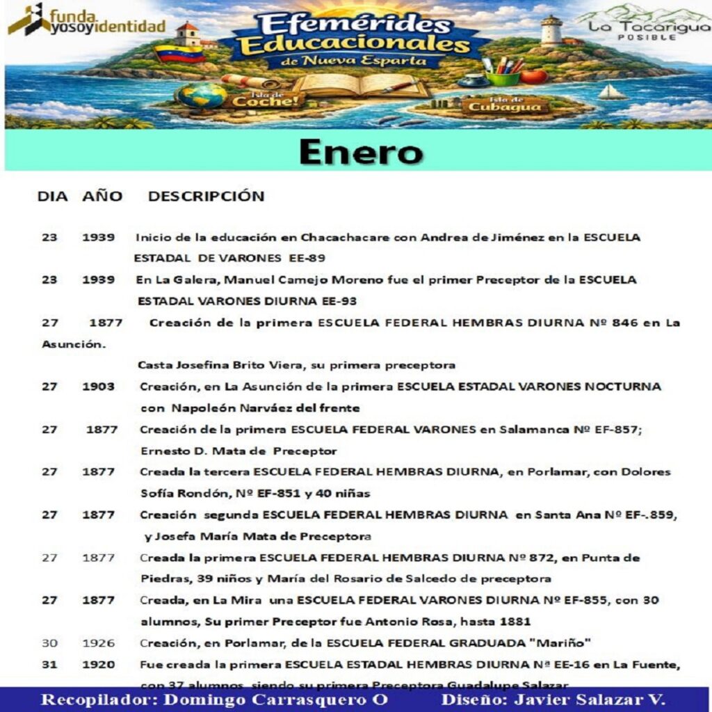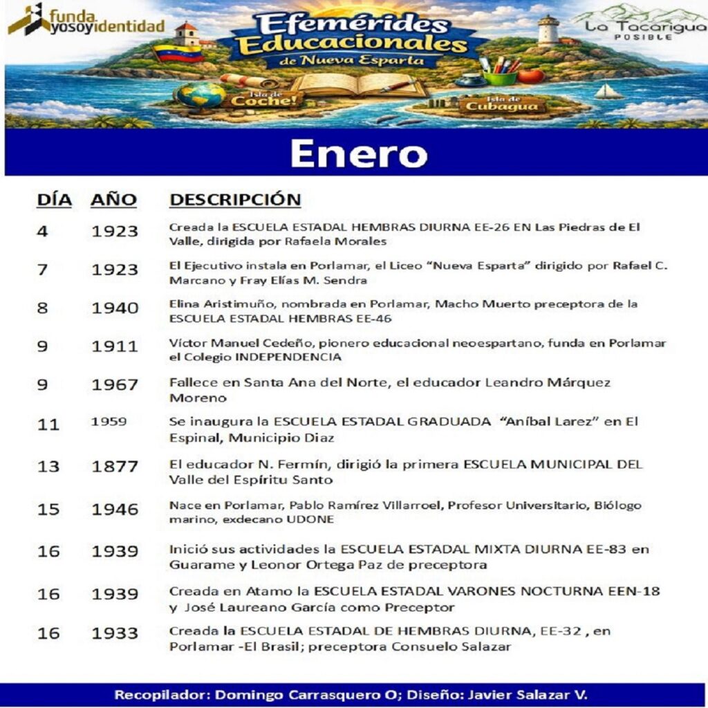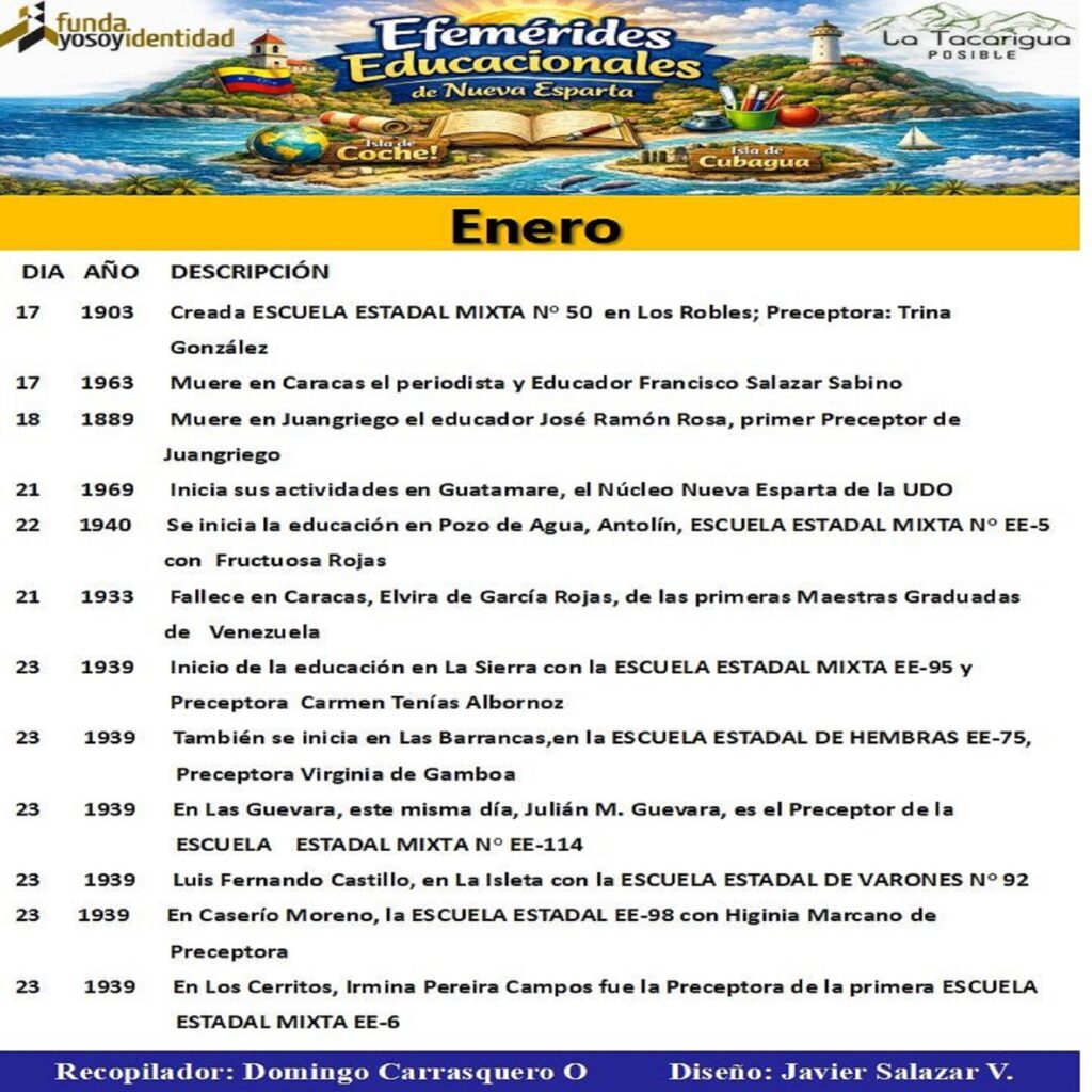 Como un homenaje a nuestros Maestros , publicamos las Efemérides Educacionales del estado Nueva Esparta del mes de enero.