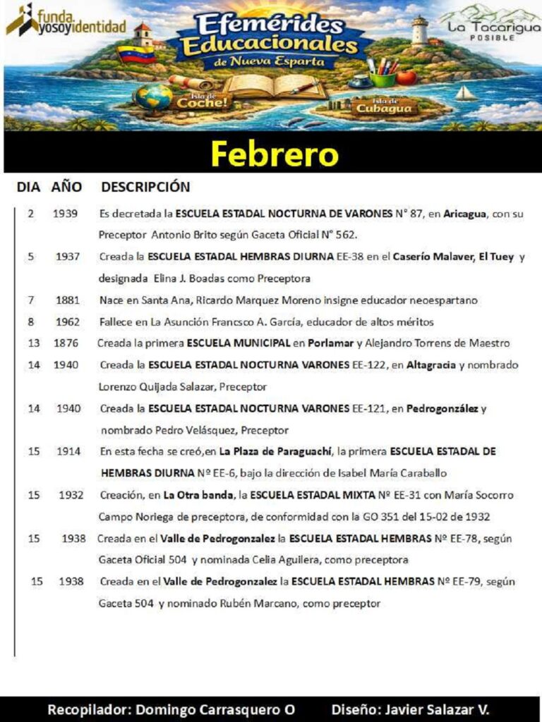 La educación Neoespartana tiene un conjunto de fechas que han hecho posible construir su Historia desde el año 1873, en el cual se inició la educación primaria en nuestro Estado, hasta el año 1949 y, en las mismas, recordamos, con la nostalgia debida, sucesos, eventos, acontecimientos que el tiempo nos transporta a ellas y nos “engarruña” el alma.