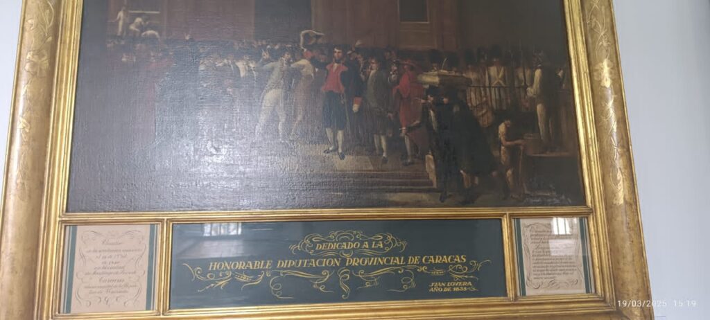 Esta obra tiene la siguiente inscripción: Cuadro de la resolución acaecida el 19 de abril de 1810 en la ciudad de Santiago de León de Caracas ahora capital de la República de Venezuela. El Tumulto se efectuó entre el frontispicio de la Iglesia Catedral y la balaustrada de la plaza hacia el Oriente. Los personajes inmediatos al Capitán General son ilustres cabildantes que le precisaron a pasar a la Sala Consistorial donde quedó sellada la Gloriosa revolución que ha dado independencia y libertad a casi todo el nuevo mundo.
