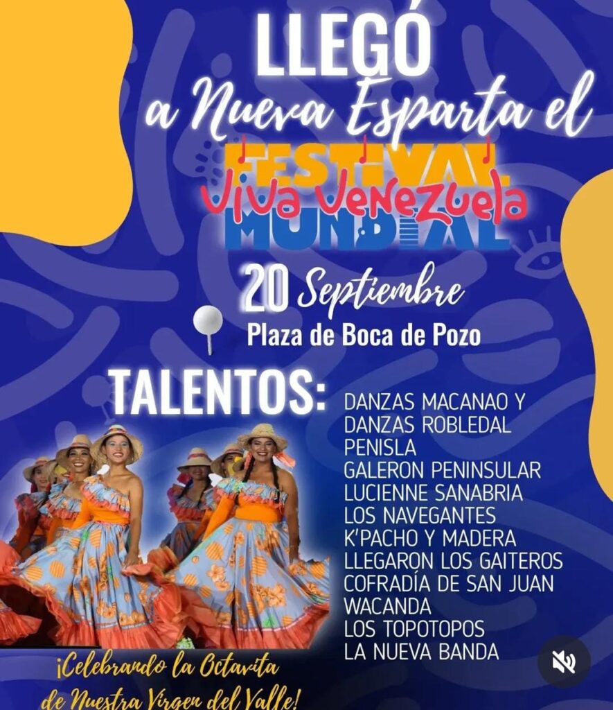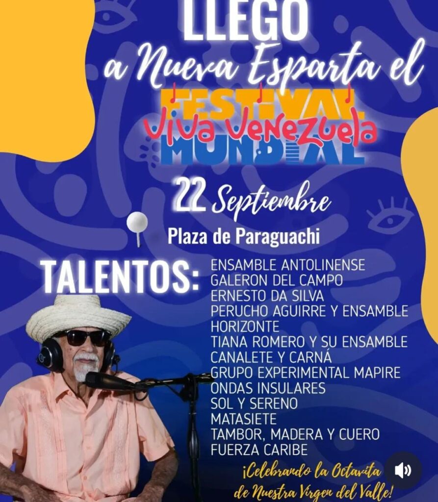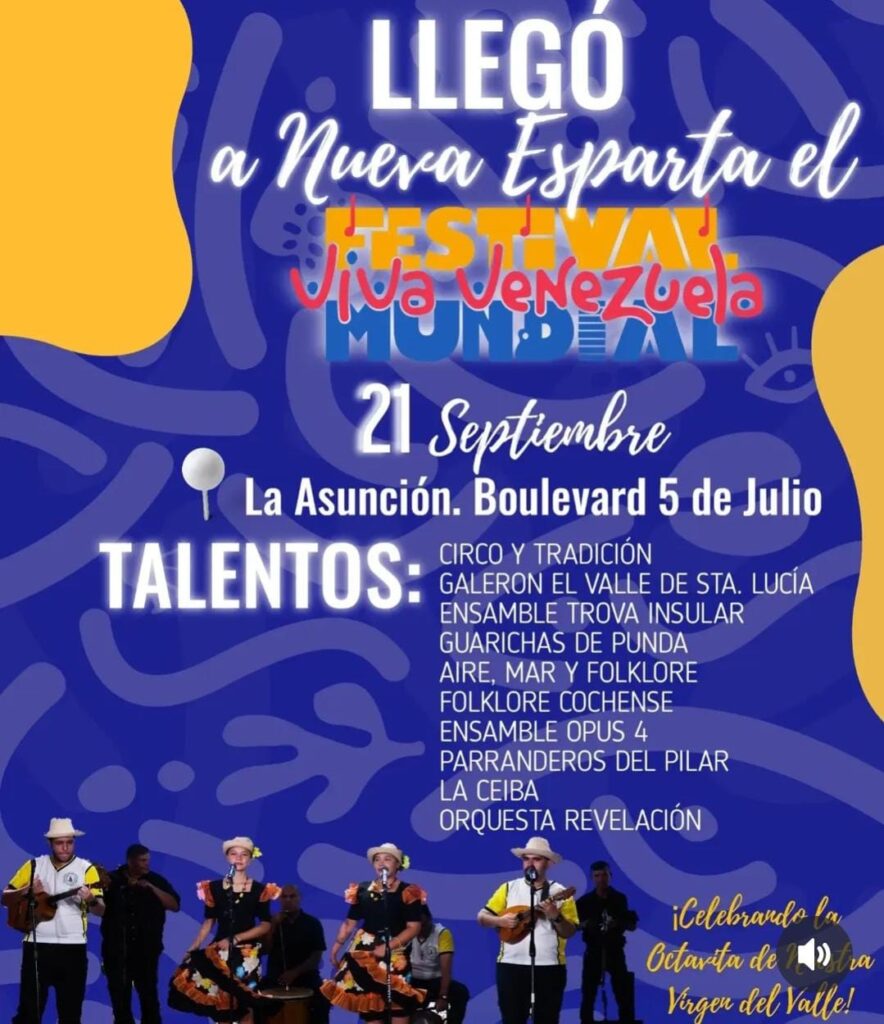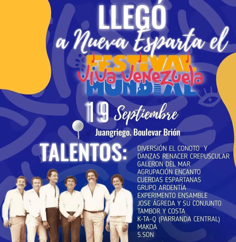Del 19 al 22 de septiembre, la isla de Margarita vivirá la experiencia del Festival Viva Venezuela Mundial, una actividad que busca promover las manifestaciones artísticas y tradicionales de Venezuela, así como ferias artesanales, música y actividades de formación. La información la dio a conocer Héctor Casanova, director general del Gabinete de Cultura del Estado Nueva Esparta.