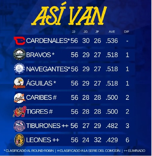 - Escenario A: Si Caribes (28-28) gana el lunes, clasifica inmediatamente como el quinto equipo del Round Robin.