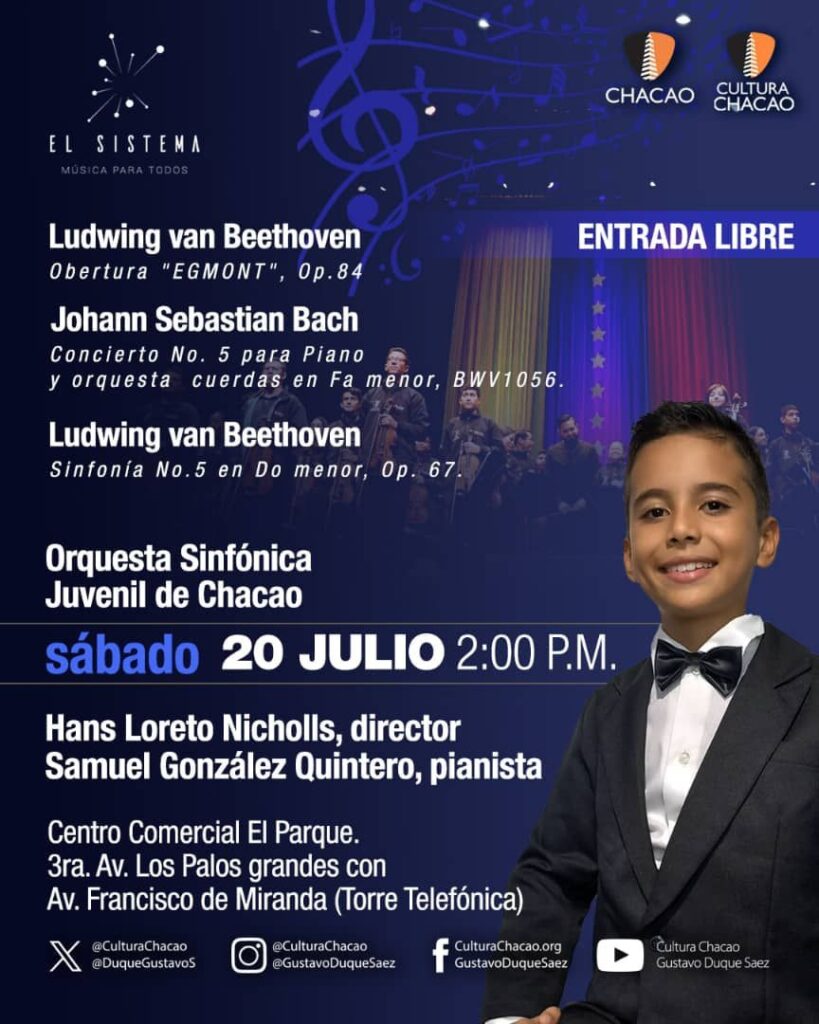 El pianista de tan solo 9 años de edad, Samuel Abraham González Quintero, ha sido invitado a tocar como solista en el esperado concierto de la Orquesta Sinfónica Juvenil de Chacao, que marcará el cierre académico del período 2023-24.